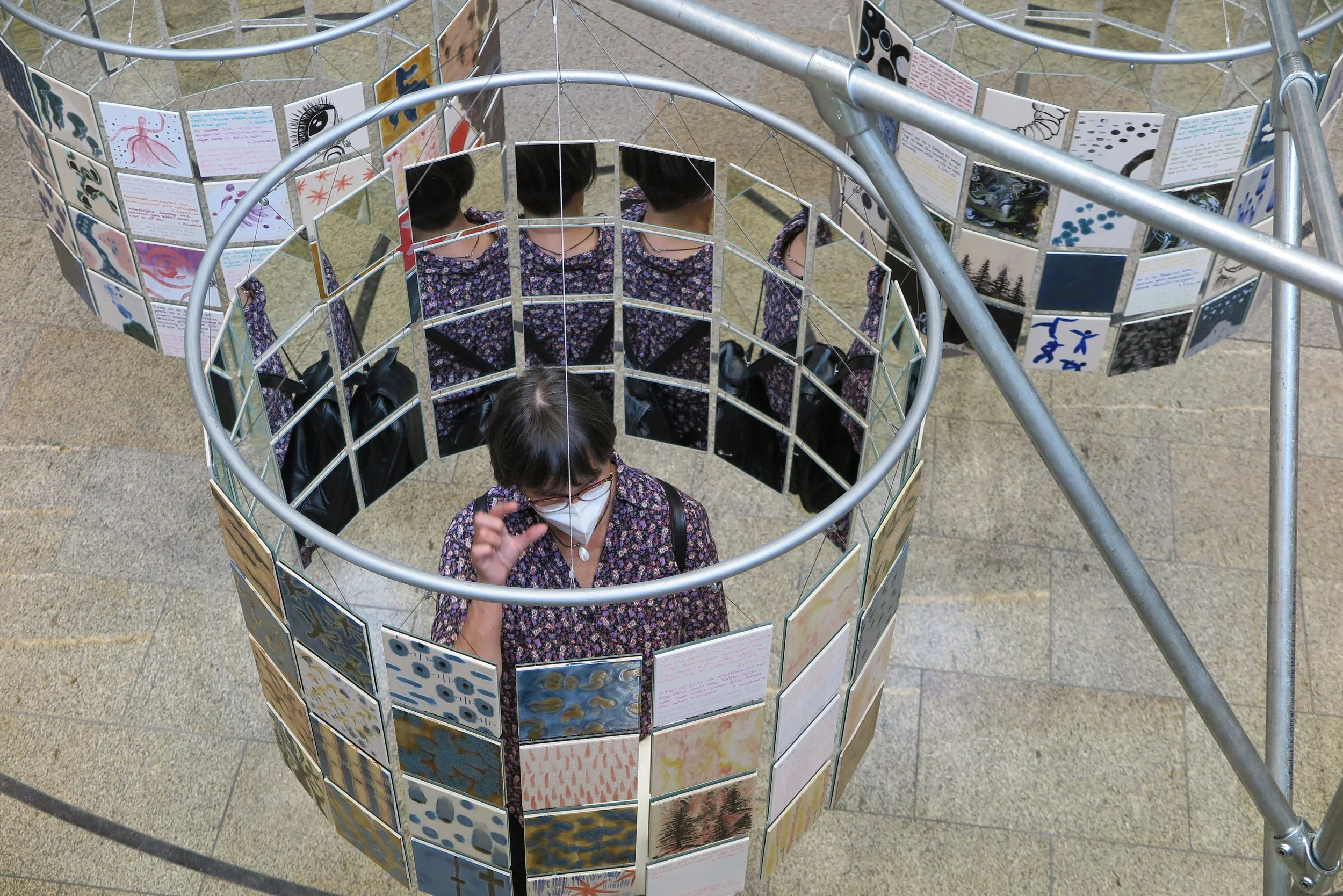 Viele meiner künstlerischen Arbeiten laden zur Interaktion ein. So ermöglicht auch diese Arbeit ein immersives Erleben: Betrachtende können es betreten, die individuell gestalteten Fliesen aus verschiedenen Perspektiven wahrnehmen und werden durch Fragen zum Nachdenken angeregt. Betritt man einen der Zylinder, wird mittels Spiegeln das eigene Selbst sichtbar und der Nachdenkprozess intensiviert.