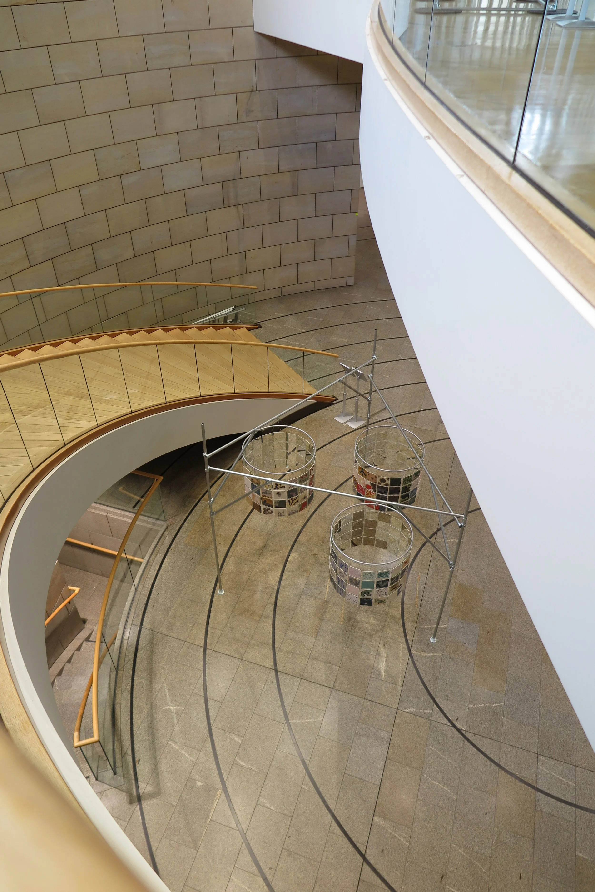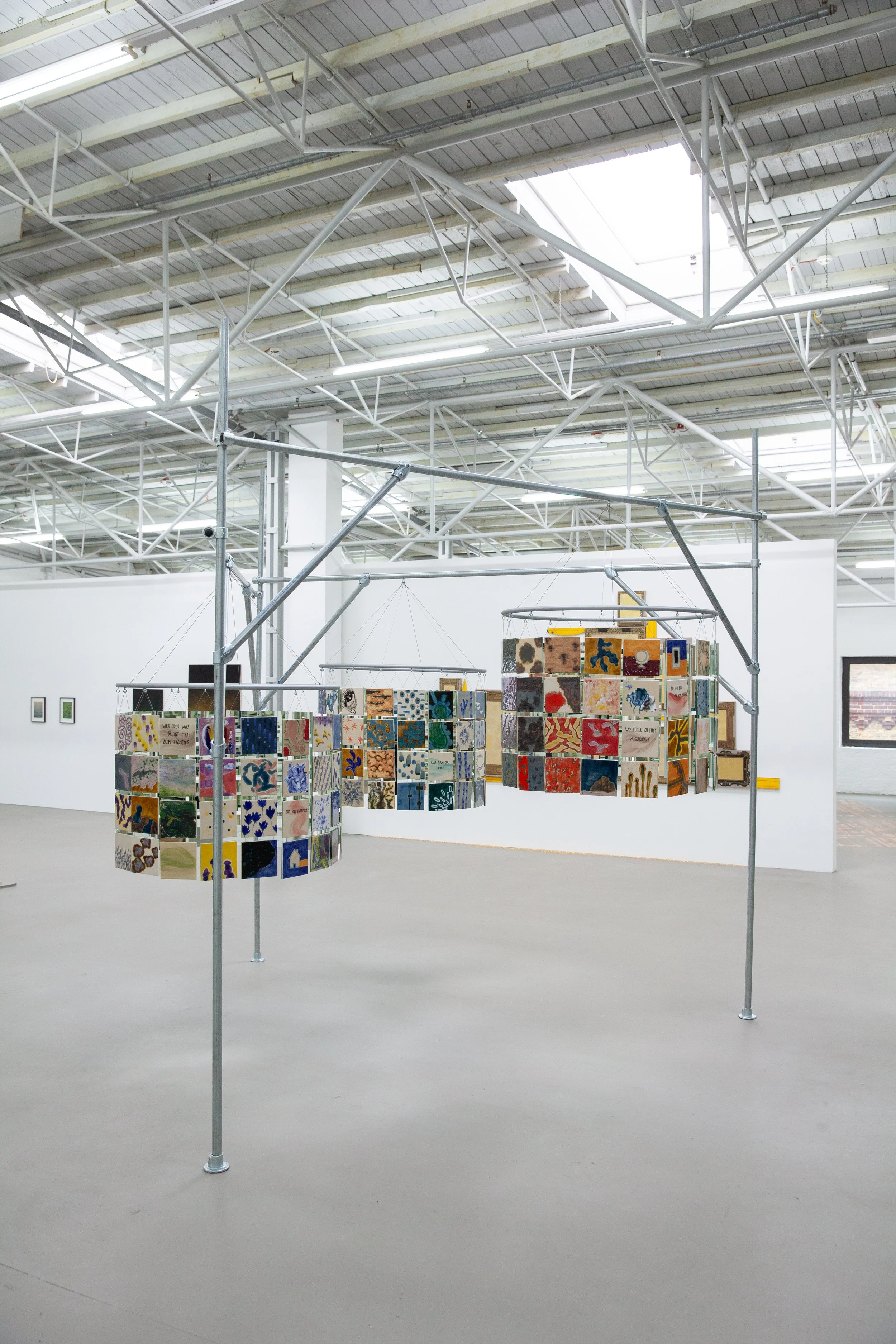 Die Installation "Keramisches Kabinett" besteht aus einem stabilen und robusten Metallgerüst, das insgesamt drei Zylinder trägt. Basis für die Zylinder sind 216 handbemalten Fliese, die eine Vielfalt an Bildern, Formen und Faben präsentieren. Die Detailarbeit verbindet auf harmonische Weise Tradition mit moderner Kunst und Kreativität. Im Inneren reflektieren glänzende Spiegelfliesen und schaffen somit eine spielerische Interaktion, indem sie sowohl das eigene Ich als auch die Umgebung auf kreative Weise erfassen. Insgesamt bietet "Keramisches Kabinett" eine einladende Möglichkeit zur Selbsterforschung und ästhetischen Reflexion.